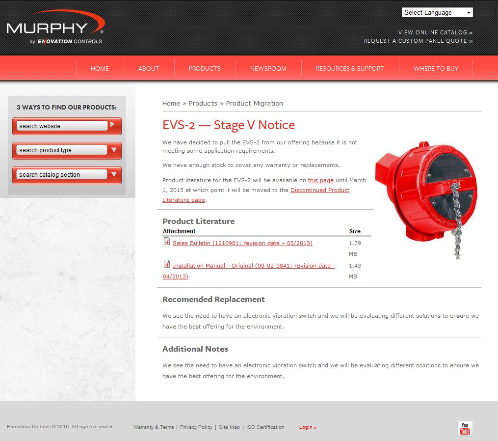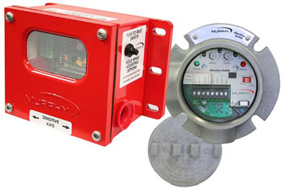 The EVS-2 is a 24VDC Electronic Vibration Switch which protects against equipment failure by monitoring velocity-based vibration levels and providing an early warning or shutdown when abnormal vibration is detected. It contains a piezoelectric-crystal internal sensor with built-in microelectronics for reduced noise sensitivity, and adjustable calibrated set-point controls. The EVS-2 can monitor and alert the operator of abnormal vibration caused by a variety of possible factors, including: imbalance and misalignments, defective sleeve bearings, broken tie down bolts, defective ball or roller bearings, gear mesh, detonation and broken parts, to name a few. The EVS-2 can be connected to Murphy's TTD™ annunciator, Centurion™ or Millenium™ controllers for increased functionality. It also compliments Murphy's VS2™ shock and excessive vibration/pulsation switch, which is designed to detect vibration due to equipment failure and shutdown other equipment in a system to prevent further damage. |